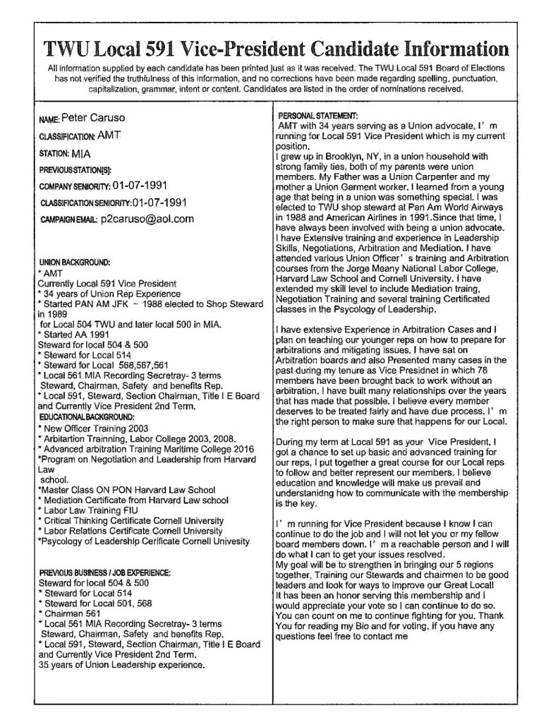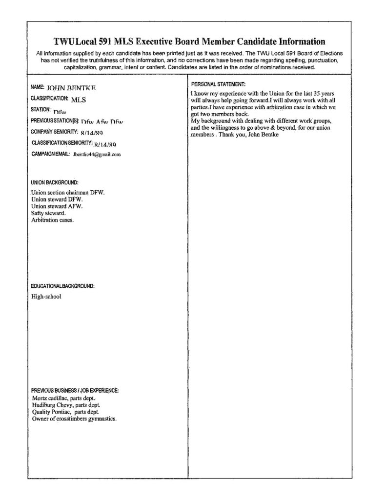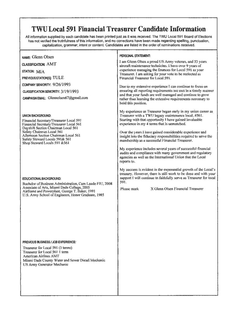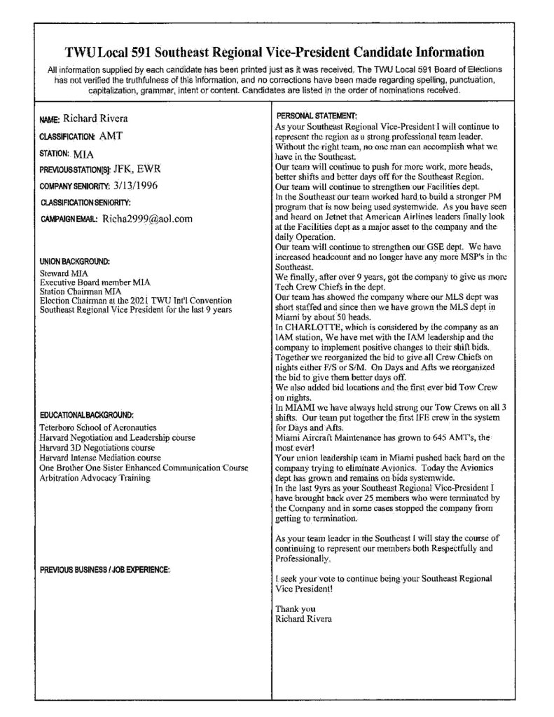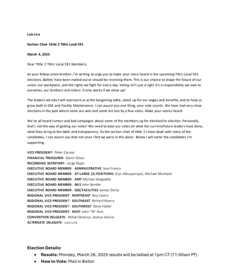 I’m asking all of you to make an informed decision on voting for your candidates, don’t fall for all this “MIA takeover nonsense,” The Question is, do you want a weak executive board who just follows what the President says without question, like a dictatorship? I certainly don’t, we need fighters on this Executive Board and the candidates that Gary Schaible is endorsing are not fighters, they will bend the knee to the Company. Is that what we want? No, we want a strong executive board regardless of what city they are from. This is why I’m endorsing the following candidates because they will represent all the members in this local and they are fighters that will challenge the company. I’m not putting the station they are from because that is not relevant, we will unite this membership!