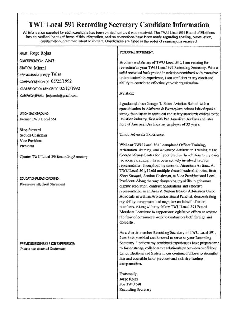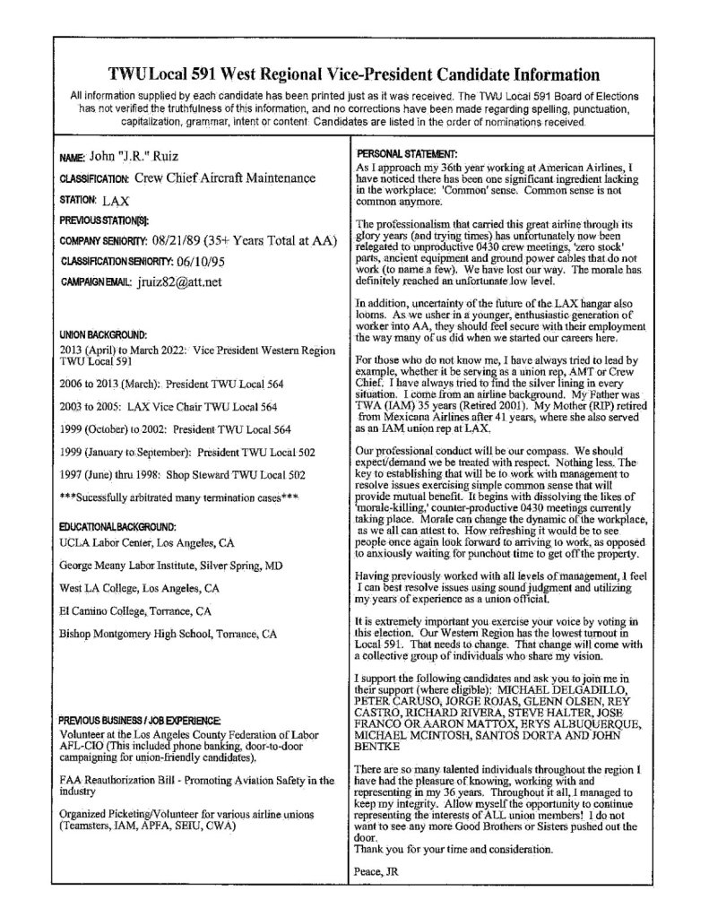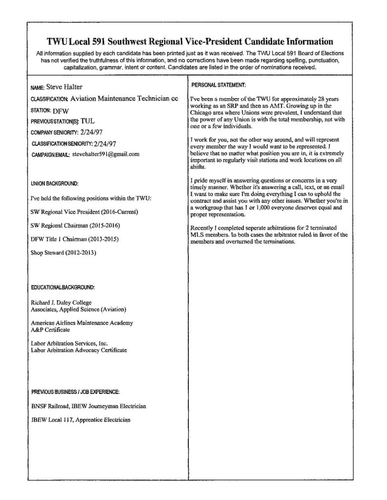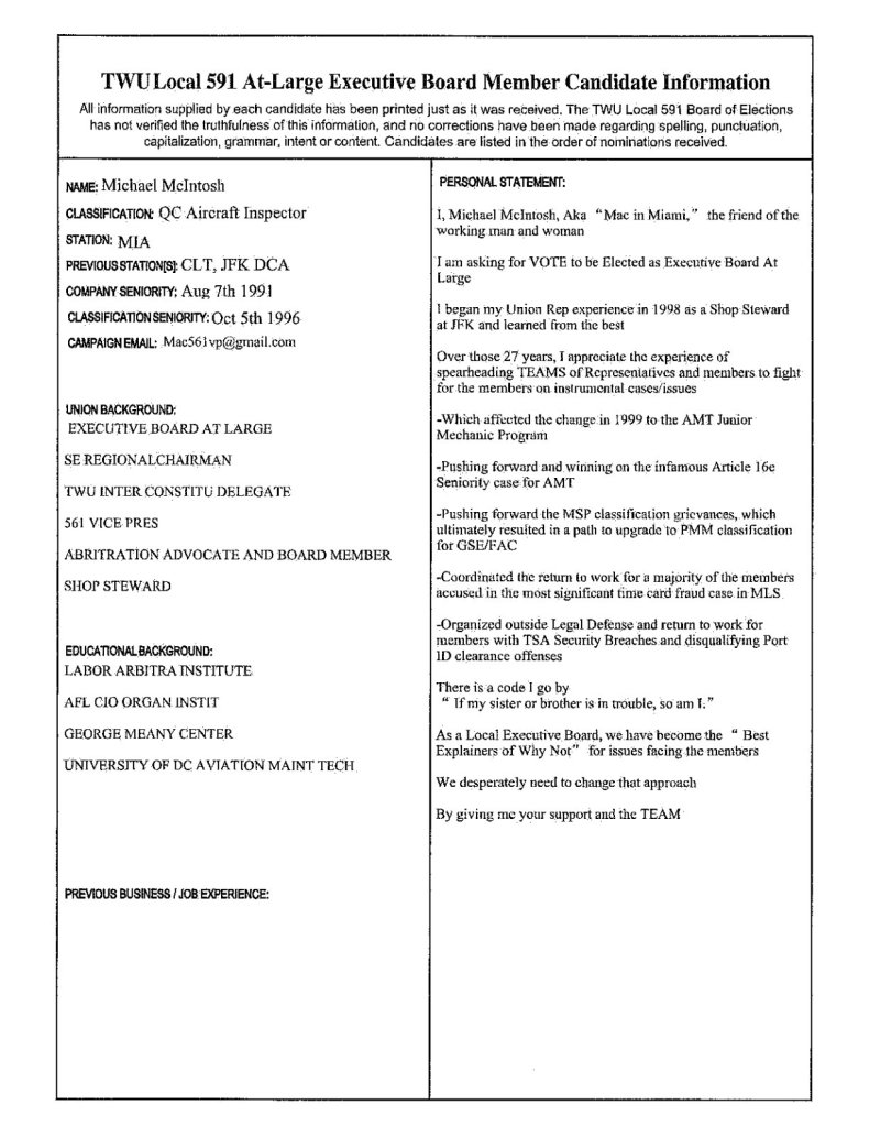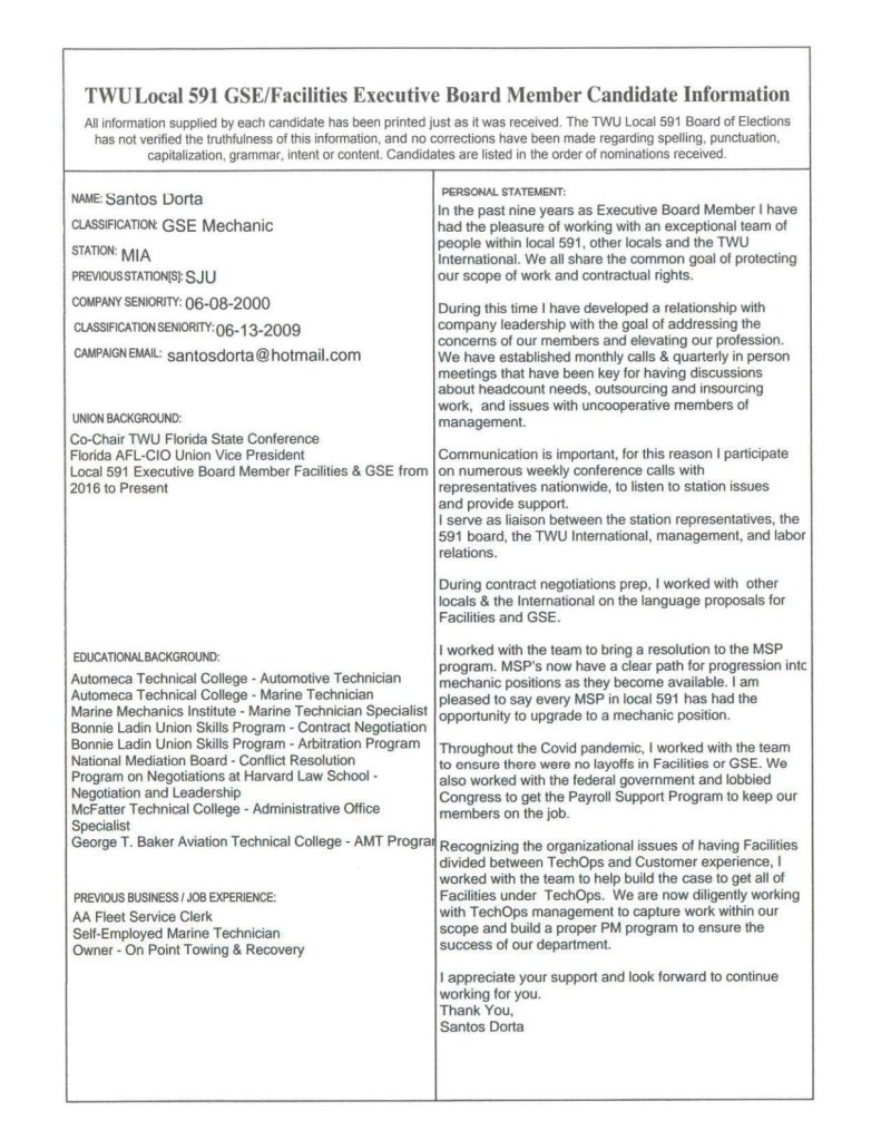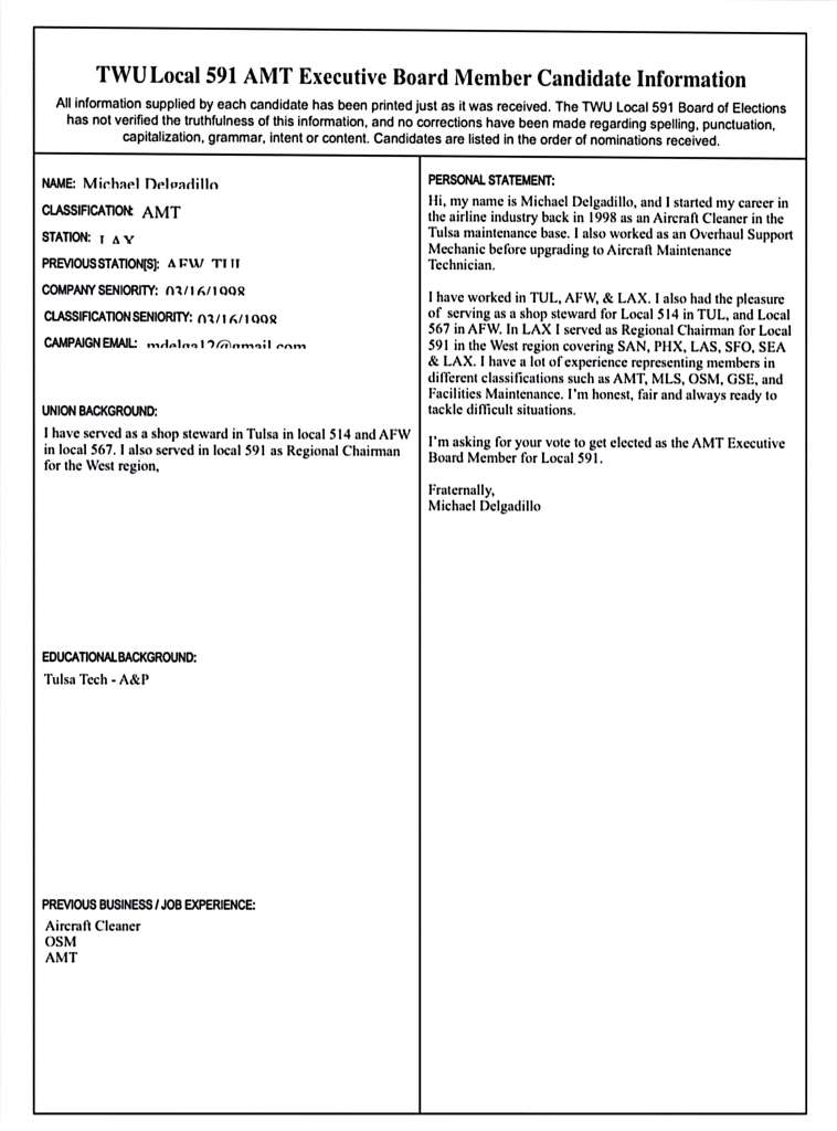 I’m asking all of you to make an informed decision on voting for your candidates, don’t fall for all this “MIA takeover nonsense,” The Question is, do you want a weak executive board who just follows what the President says without question, like a dictatorship? I certainly don’t, we need fighters on this Executive Board and the candidates that Gary Schaible is endorsing are not fighters, they will bend the knee to the Company. Is that what we want? No, we want a strong executive board regardless of what city they are from. This is why I’m endorsing the following candidates because they will represent all the members in this local and they are fighters that will challenge the company. I’m not putting the station they are from because that is not relevant, we will unite this membership!